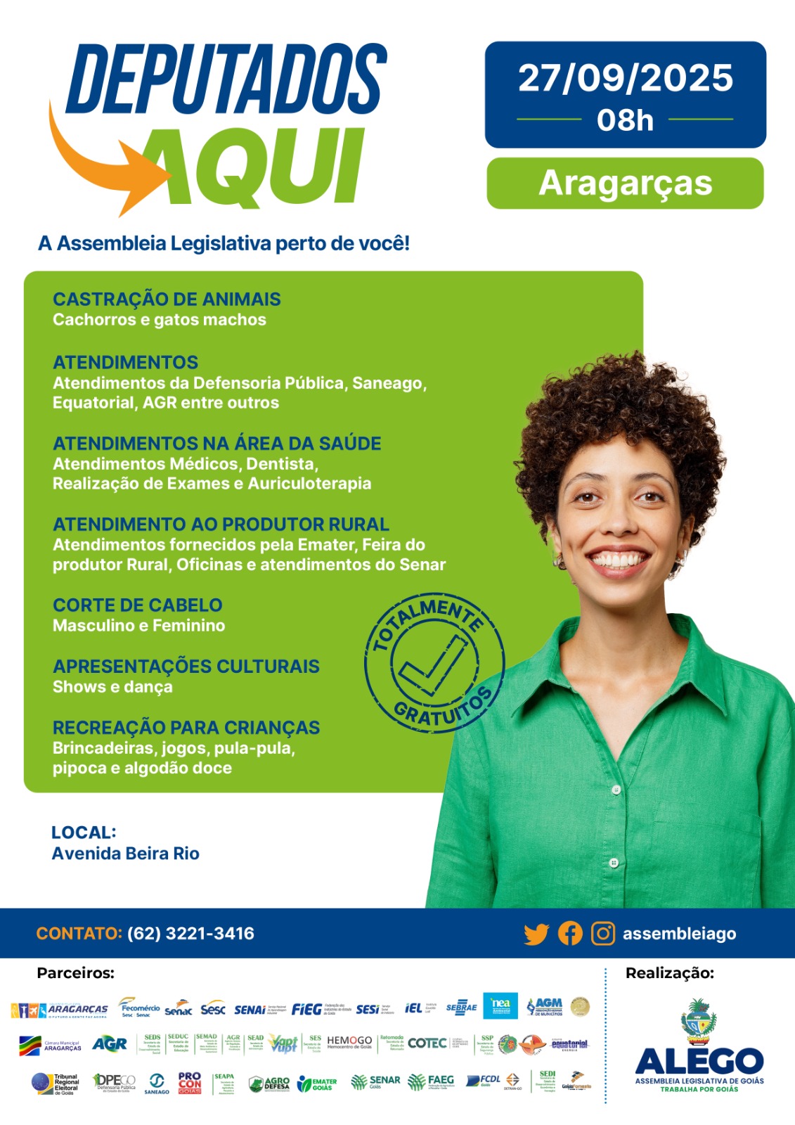 No próximo sábado (27/09), a partir das 8h da manhã, Aragarças viverá um momento histórico: pela primeira vez, o município receberá o programa “Deputados Aqui”, uma iniciativa da Assembleia Legislativa de Goiás que leva serviços e atendimentos gratuitos para a população.