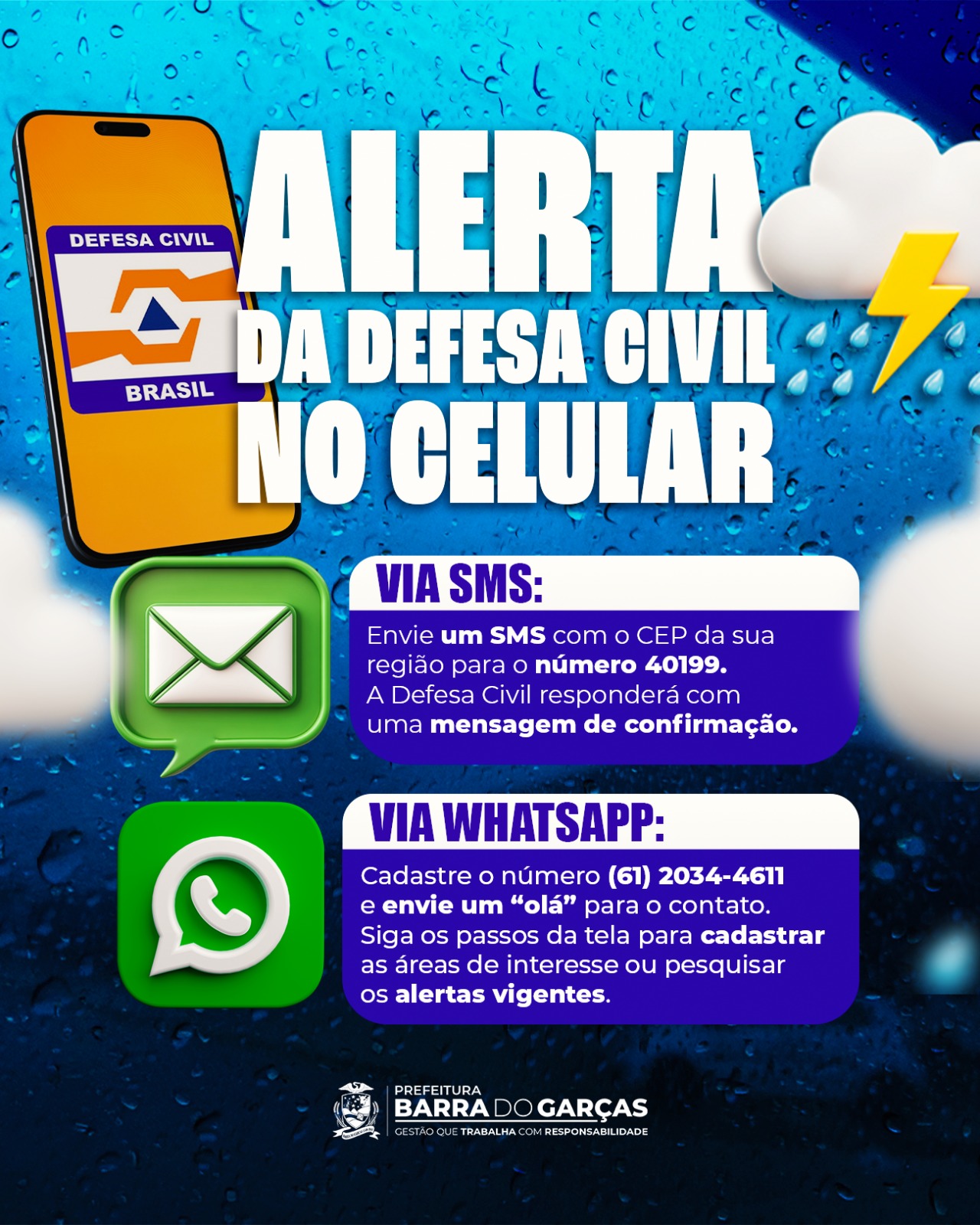 O cidadão que quiser receber alerta sobre riscos de desastres e orientações em situação de emergência, pode se cadastrar no Defesa Civil Alerta. Em Barra do Garças, assim como em todo o Brasil, as ferramentas de notificação contribuem com a prevenção de riscos na ocorrência de temporais, ventanias, chuva de granizo e alagamentos.