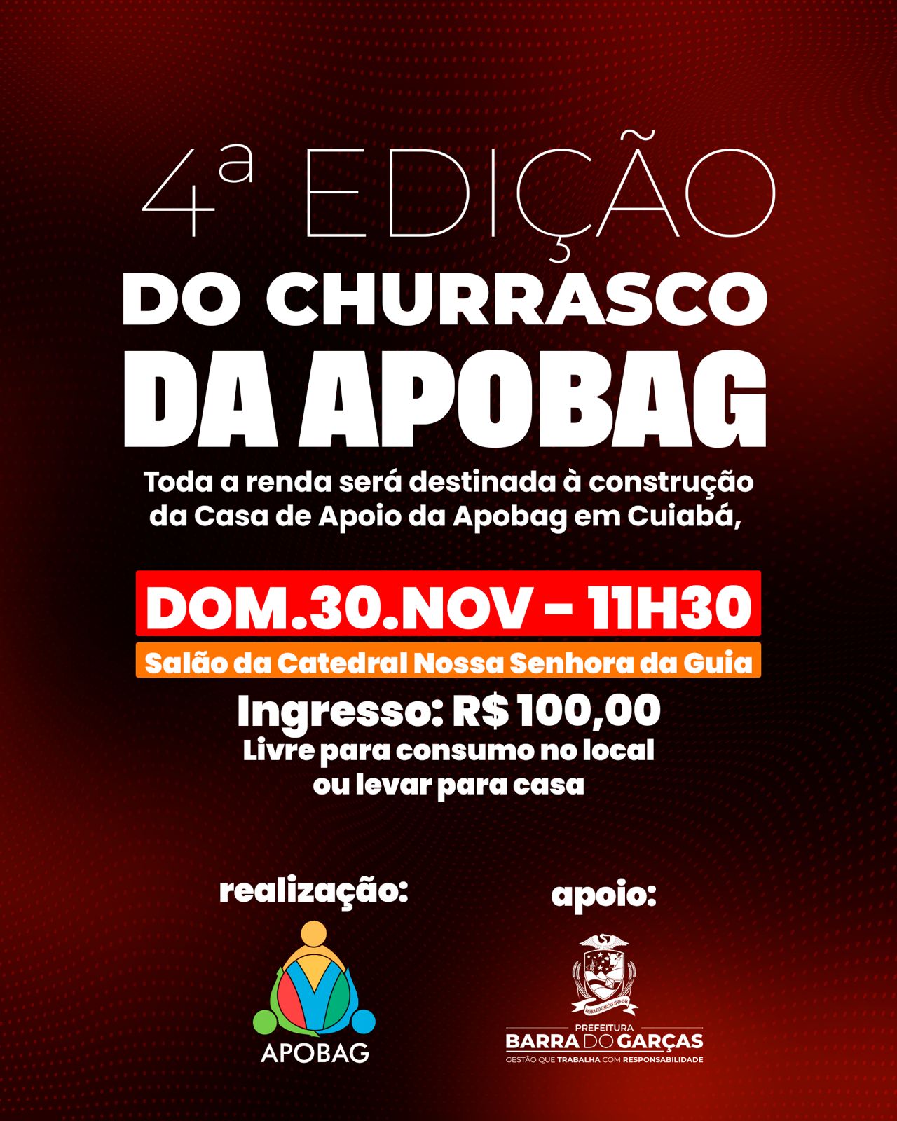 O churrasco será realizado no salão da Igreja Catedral Nossa Senhora da Guia, com início previsto para às 11h30. O valor do ingresso é de R$ 100,00, e quem optar, pode levar o churrasco para casa. Os interessados em colaborar com a causa e participar do evento podem adquirir os ingressos diretamente na sede da Apobag, que está localizada na Rua Goiás, 1050, próximo ao Batista Despachante, ou solicitar informações e realizar as compras por meio dos telefones (66) 9 9249-3535 e (66) 9 9249-6688.