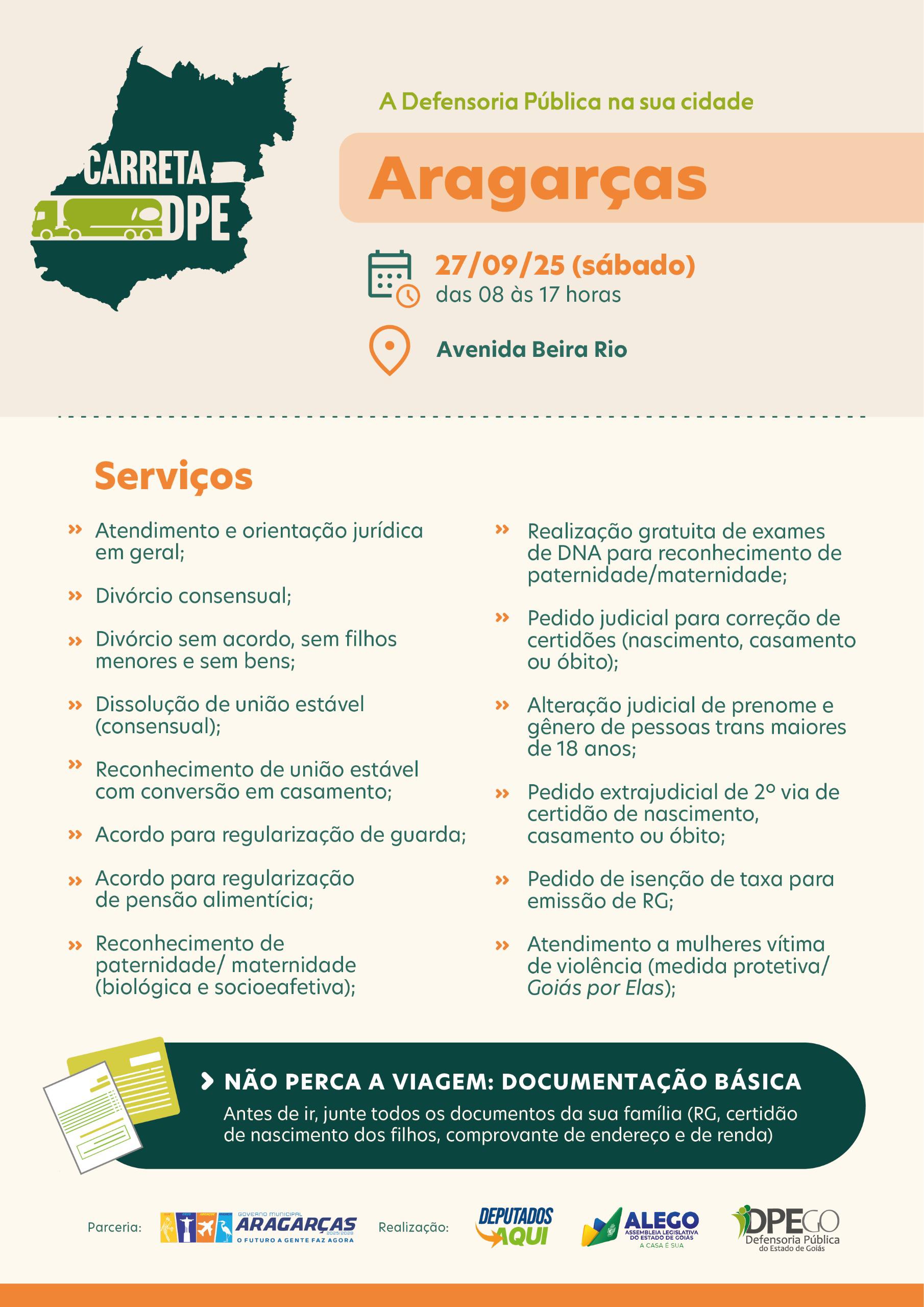 Dentro da programação do Deputados Aqui, chega ao município a Carreta da Defensoria Pública do Estado de Goiás, que ficará instalada na Avenida Beira Rio, com atendimentos gratuitos das 8h às 17h.