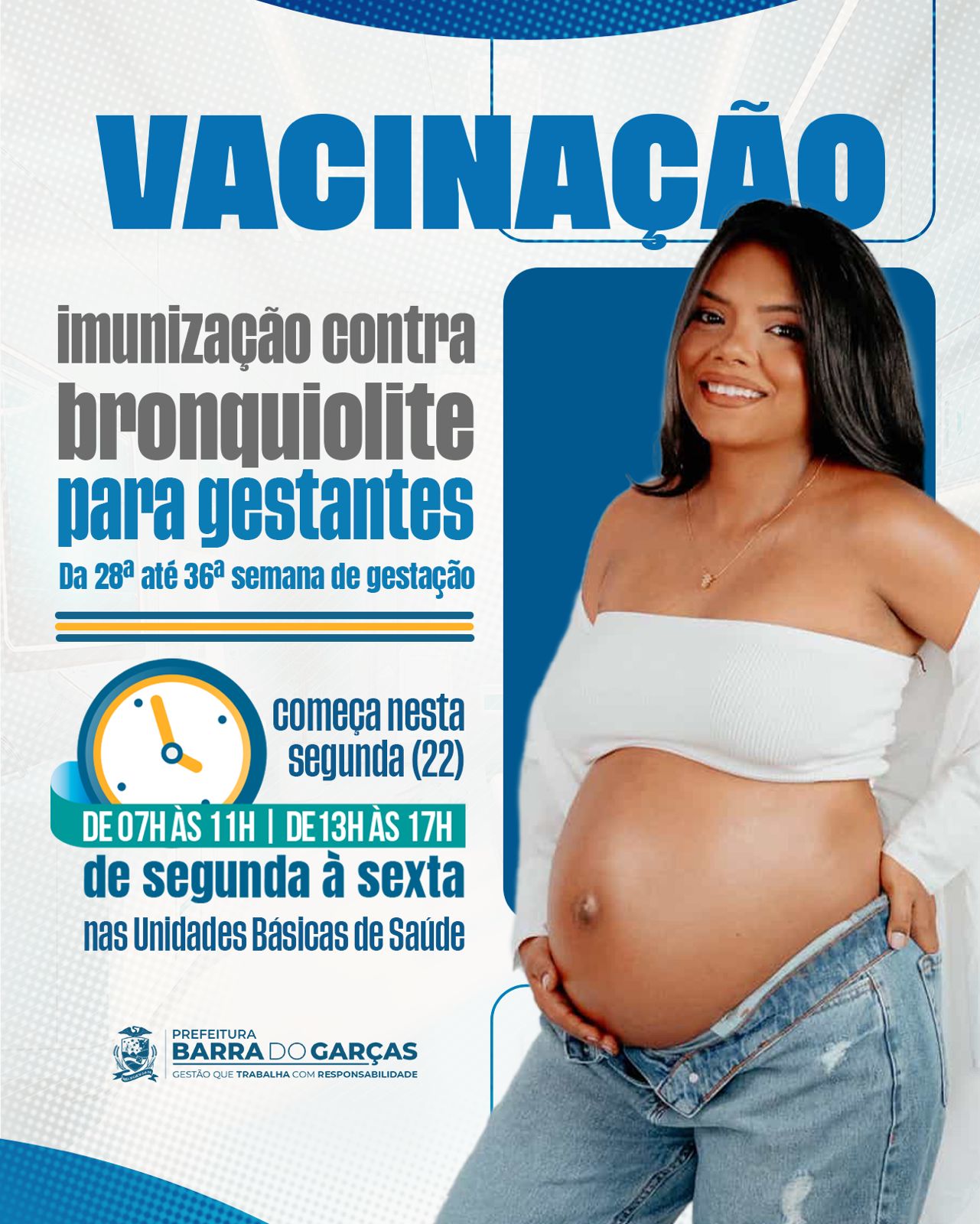 Nesta segunda-feira (22), a Prefeitura de Barra do Garças, por meio da Secretaria Municipal de Saúde, iniciará a vacinação contra a bronquiolite nas Unidades Básicas de Saúde do município. A imunização ocorrerá de segunda a sexta-feira, das 07h às 11h e das 13h às 17h.