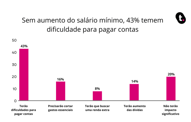 De acordo com a pesquisa Datatudo, realizada pela fintech de crédito meutudo, sobre expectativa de aumento salarial, 43% dos brasileiros afirmaram que teriam dificuldade para pagar contas caso o salário mínimo não aumentasse conforme o esperado.